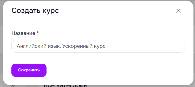 В появившемся модальном окне ведите название курса и нажмите кнопку Сохранить.