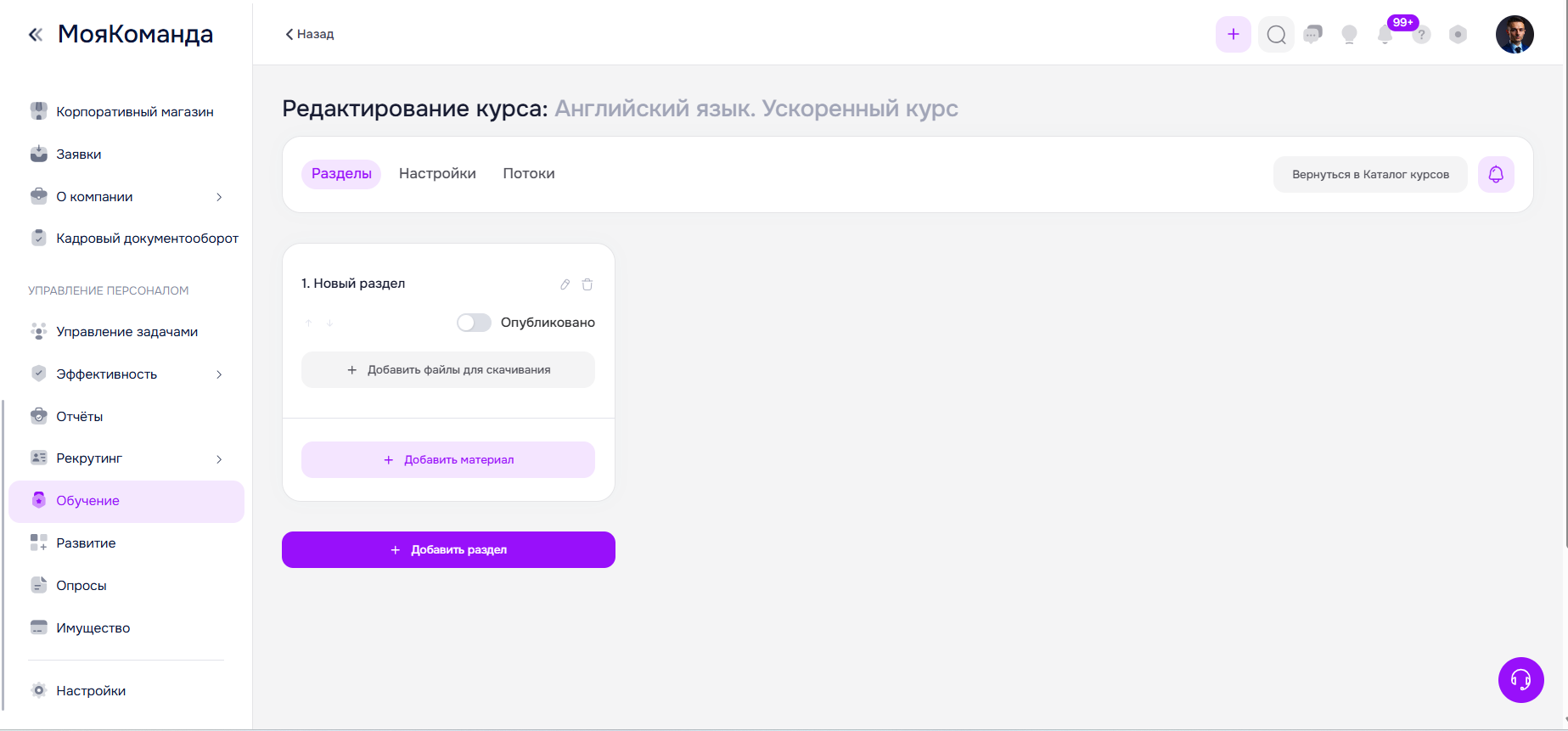 После этого откроется страница редактирования курса. Она состоит из трех вкладок - Разделы, Настройки, Потоки.