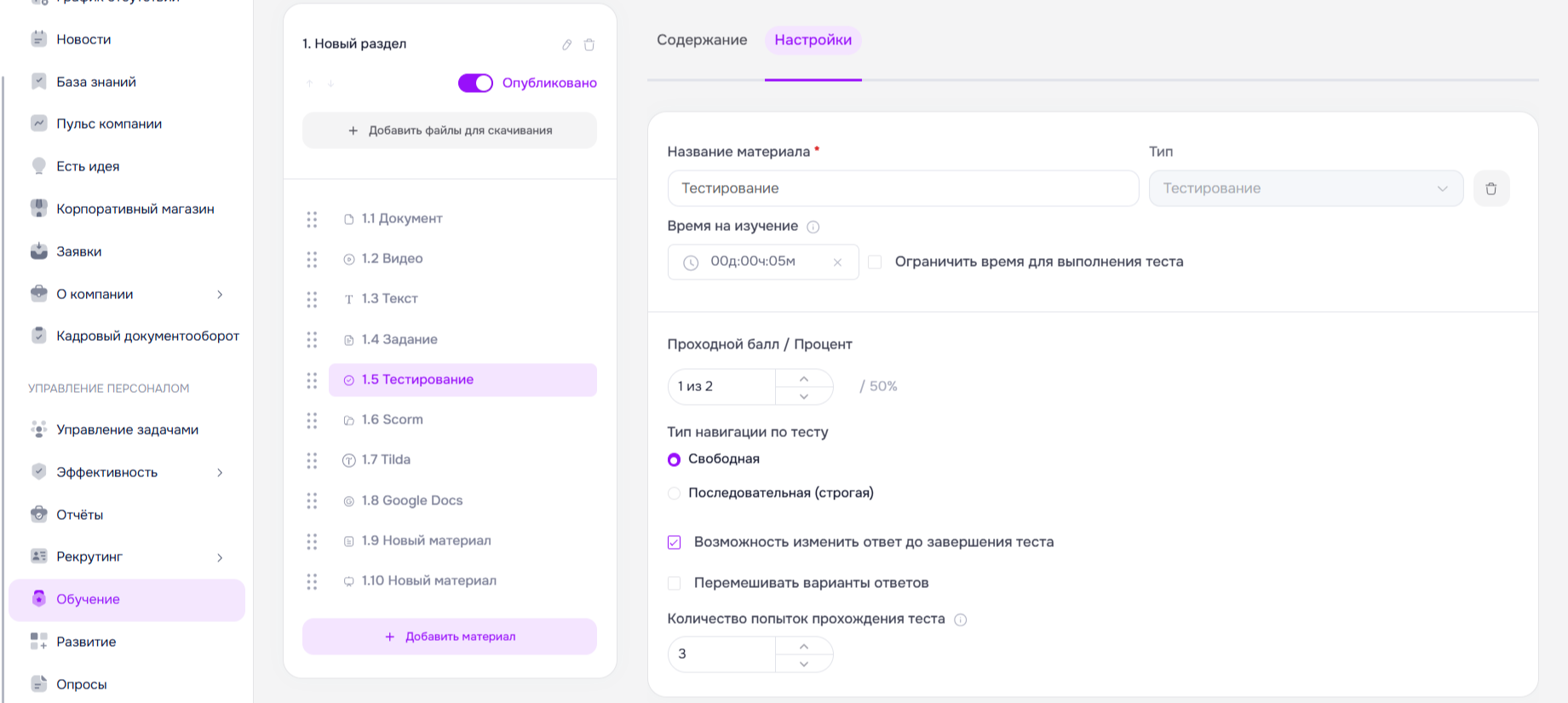Во всех типах материалов необходимо указать название материала, а также время на его изучение (по умолчанию 5 минут). Из времени на прохождение каждого материала складывается примерное время прохождения курса. Также можно ограничить минимальное время нахождения на странице материала. Сотрудник не сможет завершить материал, если не проведёт на его странице указанное время на изучение.